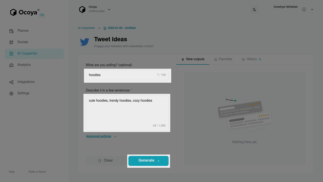 Alternatively, run the script a couple of times and simply pick the most suitable responses. That works too! Since this approach requires very little effort on your end, many users prefer to do it this way. This is exactly how Ocoya’s AI is set up. In this example, we’re going to walk you through how to generate tweet ideas for your next Twitter post.