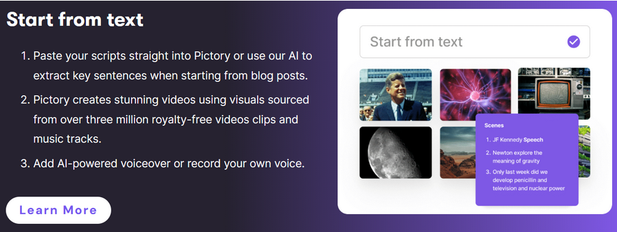 Pictory is perfect for creators who have little or no experience creating videos. It transforms scripts and written content into videos. You can, for example, convert your blog post into an interactive, engaging video, and use it for your social media or website. Pictory also automatically captions your videos, which is an important feature given how most people watch videos without the sound on.